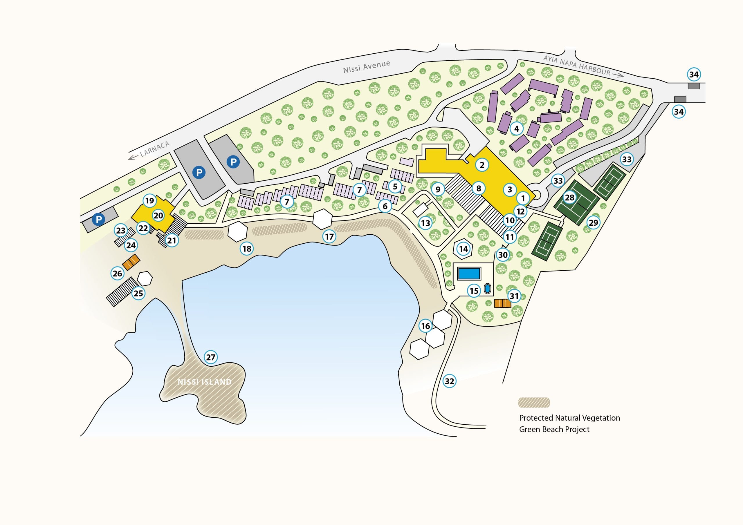 Nissi Beach Resort is a sanctuary of natural beauty, set amidst 100,000 square metres of Mediterranean gardens. Home to native plants, vibrant blooms, and majestic palms, our grounds are a tribute to Cyprus’ rich biodiversity. Designed with a deep respect for the island’s natural heritage, our gardens create a tranquil escape, seamlessly blending with the sparkling shore of Nissi Beach. Every step invites you to reconnect with nature and discover the essence of summer.